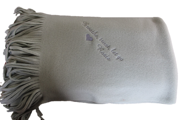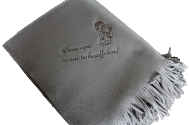 Superzachte fleece van 125 x 150 cm. Prachtig afgewerkt met mooie franjes! Wat erop komt is aan jou! Een naam, een logo, een tekening... We borduren in dezelfde stijl van een geboortekaartje, trouwuitnodiging, verjaardagkaartje... ! Een handig, warm, mooi en origineel geschenk!